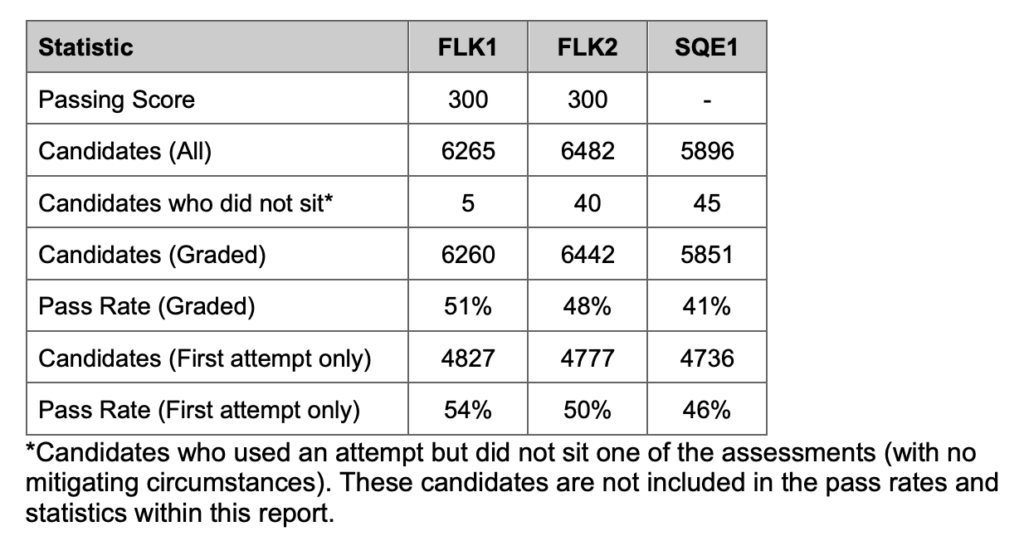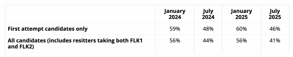 In July 2025, 5,851 candidates took FLK 1 & FLK 2 of SQE 1 and the overall pass rate was 41%.
